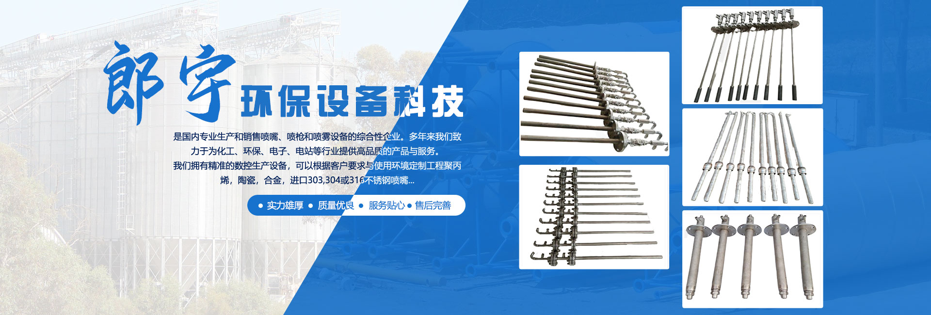 濟寧郎宇環保設備科技有限公司位于孔孟之鄉,禮儀之邦的山東省濟寧市,是國內專業生產和銷售噴嘴、噴槍和噴霧設備的綜合性企業。多年來我們致力于為化工、環保、電子、電站等行業提供高品質的產品與服務。 我們擁有精準的數控生產設備,可以根據客戶要求與使用環境定制工程聚丙烯,陶瓷,合金,進口303,304或316不銹鋼噴嘴。 我們的經營理念:誠信立企 以質取勝 價格合理 我們的技術理念:精益求精 技術創新 追求品質